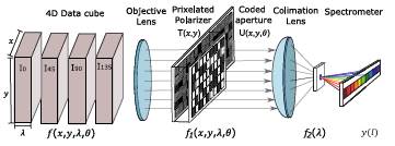 To capture spectral polarization images in a compressed manner, we propose the optical architecture shown in Figure 3. There, the scene is encoded in polarization and in spectrum by the pixelated polarizer and the coded aperture. Then the coded scene passes through the condenser lens, which concentrates the light to a point, creating a mixed pixel, which contains all the encoded information. This point is integrated by the spectrometer that divides the information into spectral ranges.