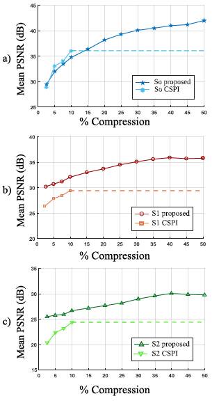Figure 9 shows the average PSNR of 20 iterations for different levels of compression from 5% to 10% with step of 2,5 and from 10% to 50% with step of 5, for 3 stokes parameters reconstructed. It can be seen that, for 2:5% to 10% levels of compression the proposed architecture outperforms CSPI in the parameters S1 and S2. In a particular case, for 2:5% the proposed method overcomes up 4:5 dB and 5:3 dB for S1 and S2 respectively, for the parameter S0 both methods have a similar quality. The dotted line represents the maximum PSNR achieved by CSPI because taking more snapshots is not possible.