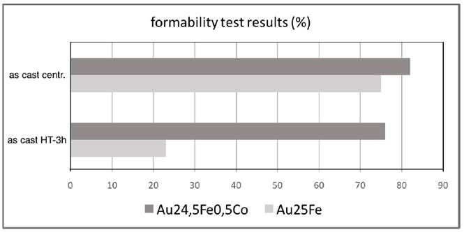 The formability results for the as-cast samples revealed a 23% deformation (rolling mill) for the Au-25Fe versus a 62% for the Au-24.5Fe-0.5Co alloy (HT-1h; T=900°C), whilst for the as-cast centrifuged sample revealed a 75% deformation with ductile fracture for the Au-25Fe versus an 82% without fracture for the Au-24.5Fe-0.5Co alloy. This result is particularly promissory for the applications in jewelry, showing that the addition of cobalt increases the formability of Au-Fe alloys.