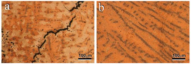 The Au25Fe system must have a similar morphology to that of the Au22Fe, already widely studied and reported [2-3]. The first dendrites to be formed are γ-Fe (or acicular ferrite) [Figure 5a, dark areas), which are surrounded by the rich gold phase [Figure 5a, whitish areas), as concluded from the AuFe system phase diagram [Figure 1]. For our Au25Fe sample obtained as-cast [Figure 6], these two phases are present. The darker area in Figure 6b (interdendritic zone) corresponds to the eutectoid reaction.
