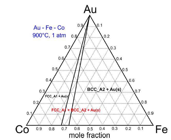 To represent the ternary diagram of the Au-24.5Fe-0.5Co system, the FactSage thermochemical software and databases were used, under the following conditions: 1200ºC (fusion) and 900ºC (heat treatment) at 1 atmosphere of pressure.