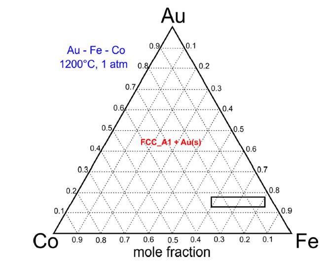Figure 14 shows the ternary diagram AuFeCo a (1200°C, 1 atm), for the centrifuged Au-24.5Fe-0.5Co. The corresponding structure is then FCC, which is the same structure of pure gold.