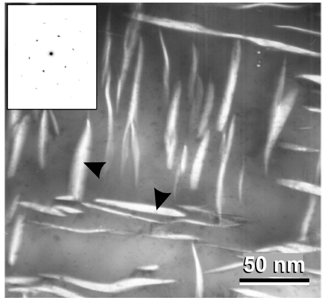 For this alloy, initially obtained with the Melt Spinning technique (TT; T=320°C, 168h), ferrite BCC acicular are precipitated. The acicular are about 5-10 nm thick and ca. 50 nm long, embedded in an Au FCC matrix [Figure 2] [3].