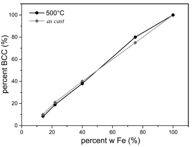 In the Au-Fe alloys, the microstructures in as-cast condition exhibit ferrite α (BCC) and solid solution of Au(Fe) (FCC). The existence of (α)ferrite increases directly with the content of iron. Figure 2 shows the role of the α phase BCC in the structure of the Au-Fe alloys, determined with XRD and the theoretical predictions of the phase diagram depicted in Figure 1 [2-3].