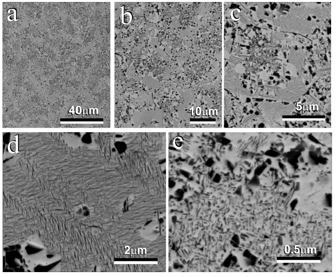 The darker areas, iron-rich, precipitate the eutectoid composite [Figure 4c, d); more clearly observed in Figure 4f, according to the Equation. (1):