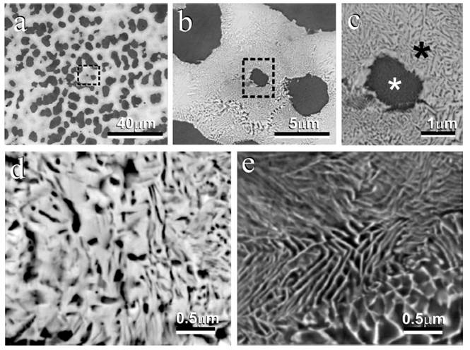 In Figures 4c and 4d, the lighter old-rich regions correspond to the interdendritic composite, which precipitate Fe(α) from the solid solution (Au), according to the Equation. (2):