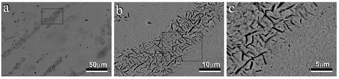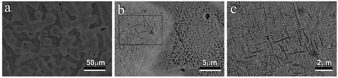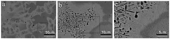 The SEM micrographs corresponding to an alloy Au-40Fe (% weight) in as-cast [Figure 5], show the dendrites of the austenite primary γ-FCC (dark) and the interdendritic composite (light) Au(Fe) FCC (Equation. (3)]. The peritectic reaction is evident in the light area around the dendrite (dark areas in Figure 5a, b and magnified in Figure 5c) [5].