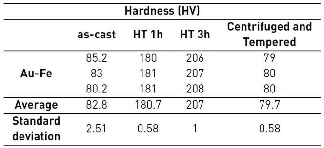 In order to compare the hardness of the samples as-cast-HT-3h and as-cast centrifuged, they were subjected to the Vicker´s hardness test, as measured with the micro-hardness tester [Tables 1 and 2, and Figure 11].