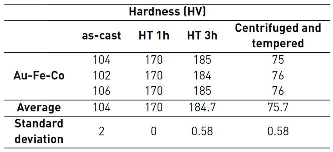 For the as-cast samples, the one with the addition of cobalt is also the harder. Subsequent heat treatment hardens the samples, presumably due to the significant augment of the Au(Fe) phase.