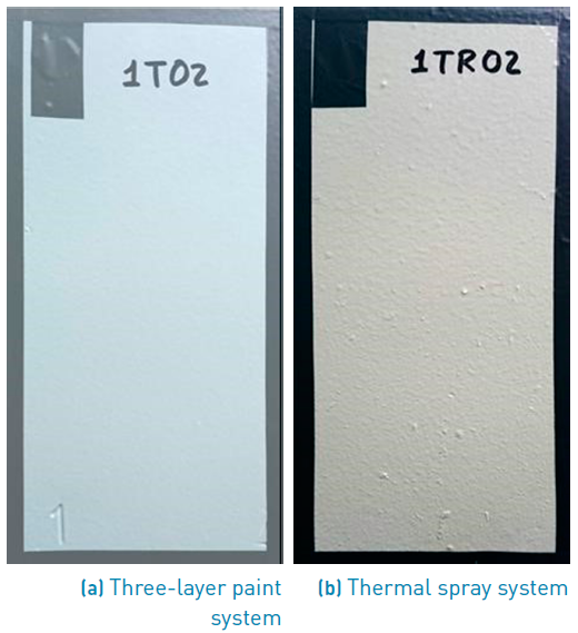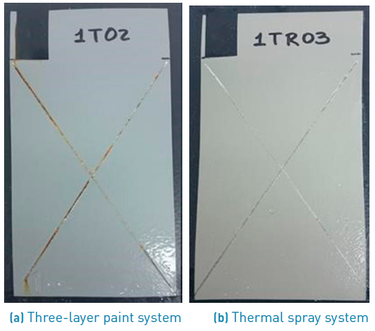The performance of both protective systems after 1920 hours of oxidation can be seen in Figure 2. Figure 2a corresponding to the three-layer paint system shows substrate oxidation due to formation of iron oxides, which in turn interfere with coating adherence and accelerate the detriment of the paint properties. In contrast, the thermal spray system does not present iron oxides, because aluminum layer created an alumina layer of white colour that protects the substrate from oxidation [18-20] without affecting paint adherence [Figure 2b). Adherence tests confirmed the above.