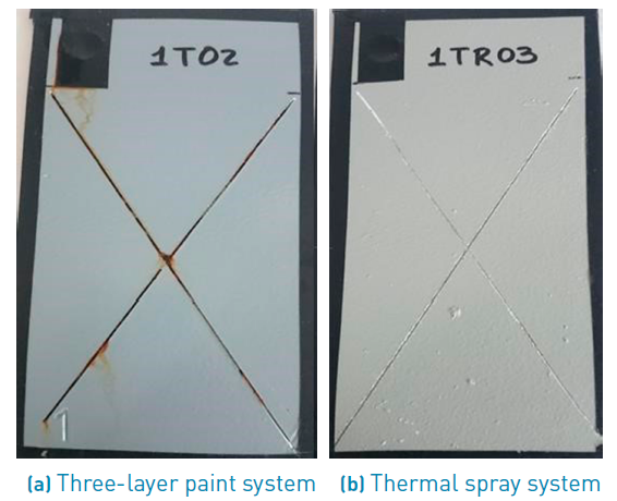 Neither of the two systems exhibited deterioration signs when the first stage of characterization took place (1448 hours), this behaviour is in accordance with the claims of manufacturer for the case of the three-layer painting system. To accelerate the corrosion process, ASTM B117 standard suggests to scratch the surface of samples.