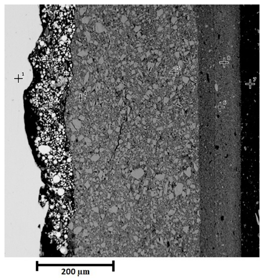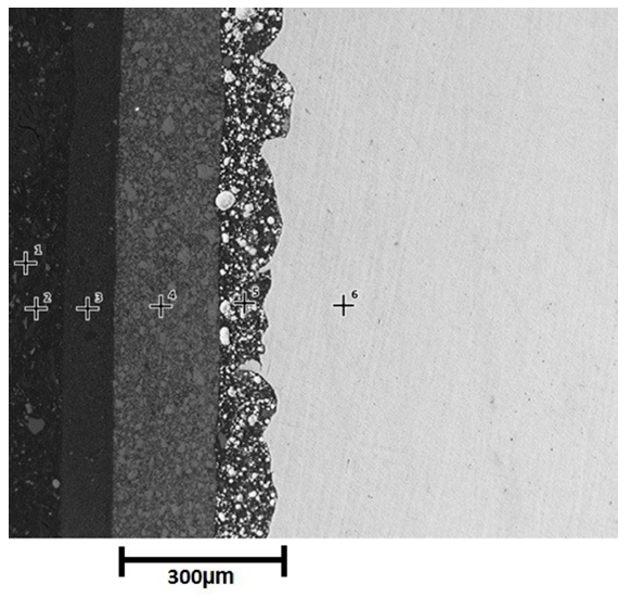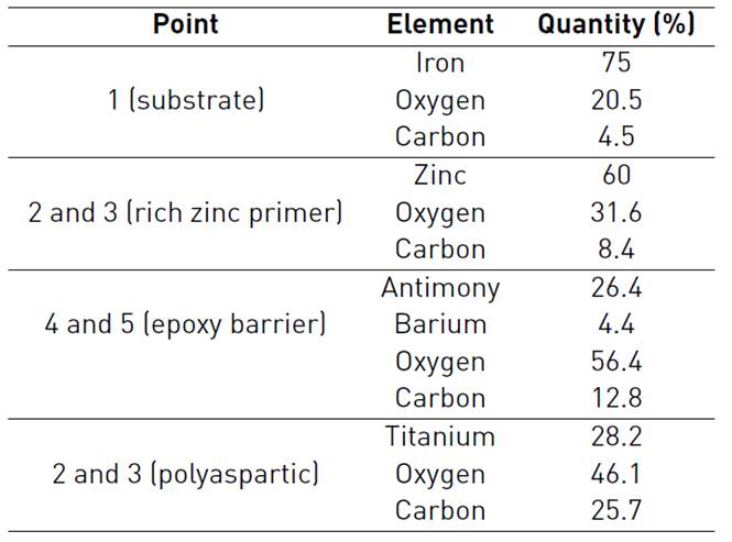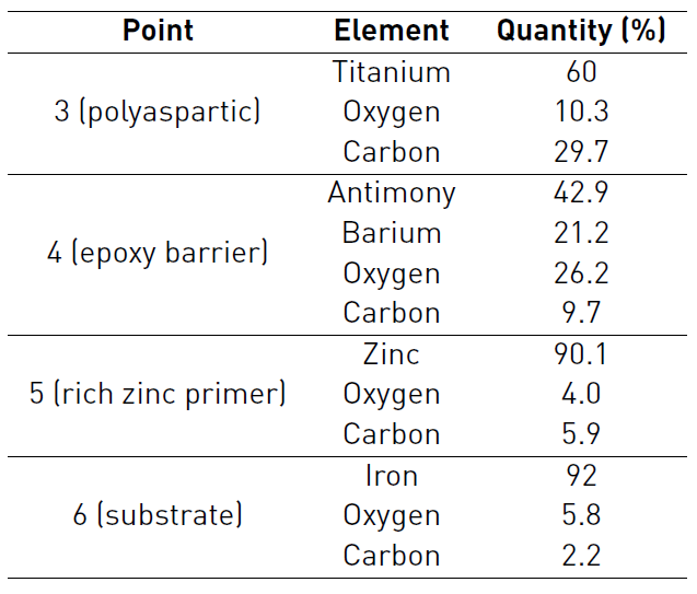 Figure 4 shows a cross section of three-layer paint system before exposure to saline environment. Points 1 and 2 correspond to the resin, point 3 represents the Polyaspartic finish layer, point 4 depicts the epoxy barrier and finally the zinc rich primer and the substrate are indicated by point 5 and 6 respectively. The morphology of three-layer paint system shows low porosity (4.5%), reported by microscopy techniques, no micro cracks and contact between zinc particles and substrate (allowing cathodic protection of substrate). Figure 4 attests to the continuity of the paint-substrate interphase, which suggests good adherence of painting to substrate thanks to rugosity on the substrate provided by sandblasting [20].
