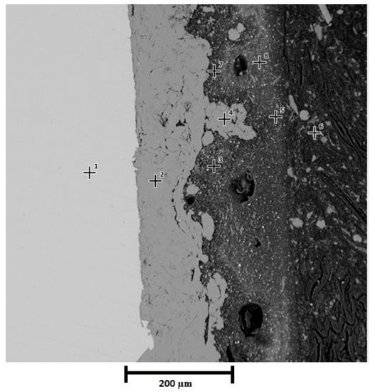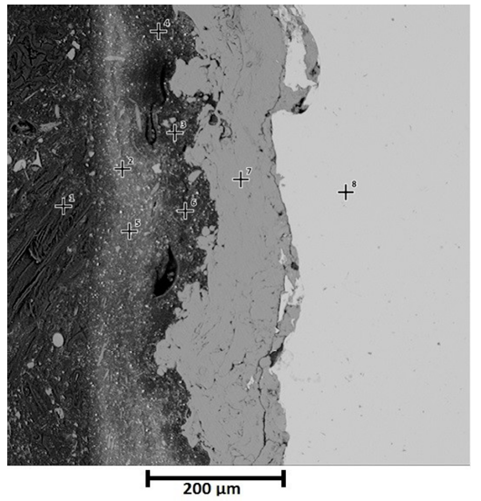 Cross section of thermal spray system before exposure to saline environment can be seen in Figure 5. Points 1 depicts the resin, polyaspartic finish layer is indicated by points 2 and 5, points 3, 4 and 6 represent epoxy barrier and finally points 7 and 8 correspond to aluminum layer and substrate respectively. For thermal spray system, good adherence was not only verified in substrate-coating interphase but also in coating-paint interphase. Since the aluminum deposited replicated the roughness obtained after sandblasting. It is important to clarify that the spaces observed on the Figure 5 are characteristic of paint, not of the interphase paint - aluminum layer. For that reason, the appreciation of good adherence is in accordance with Pull Off tests.