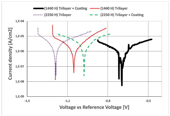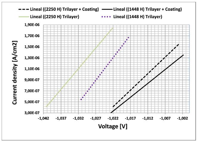Based on the literature, the corrosion current for low carbon steels is in average 1.4 x10-4 A/cm2 [34,35], and the thermal spray system reported in average 1.2 x10-5 A/cm2, while three-layer painting system reported 1.8 x10-5 A/cm2; this information is observable on Figure 9.