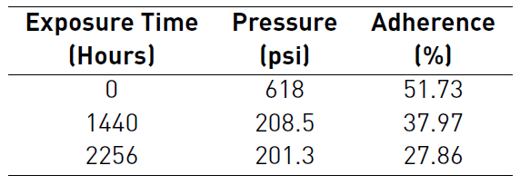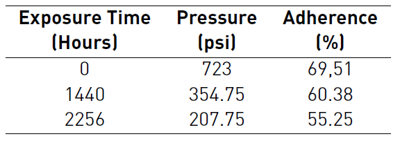 Tables 1 and 2 detailed the behavior of pressure and adherence during Pull-Off test for both protective systems. The tables also report higher pressures for the thermal spray system to remove the dollies. With the first dollies removal after 1440 hours, thermal spray system was only affected by a 39,62% of coating detachment that only included the external layer of polyaspartic. While three-layer paint system was affected by a 48,27% of coating detachment that included the external layer of Polyaspartic and epoxy barrier. Despite percentages of adherence decreased during longer periods of exposure for both systems, the adherence loss is less accelerated in the case of three-layer paint system.
