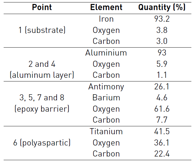 Aiming to keep track of changes in adherence and chemical composition of samples, SEM and EDS analysis were performed after 2256 hours of exposure. In relation to the three-layer paint system, SEM cross section view [Figure 6] and Table 5 compare the topography of every zone and their chemical composition.