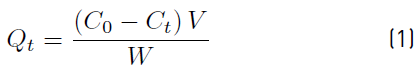C0 and Ct are the initial and final concentration (mg/L), respectively. W is the amount of imine-chitosan derivative, and V is the volume of the solution.