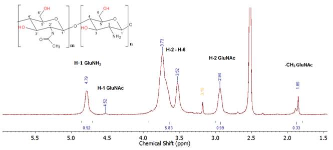 1H-NMR spectra of chitosan and its derivatives were obtained, using DMSO-d6 /CF3COOD and D2O/CF3COOD (3:1). The NMR experiments were conducted at 45 °C. NMR signals were assigned according with reported data [55-57].The degree of deacetilation (DD) was calculated using 1H-NMR by following the indications on reference [44]. Likewise, the DD was determined by CHN elemental analysis as described by reference [58].