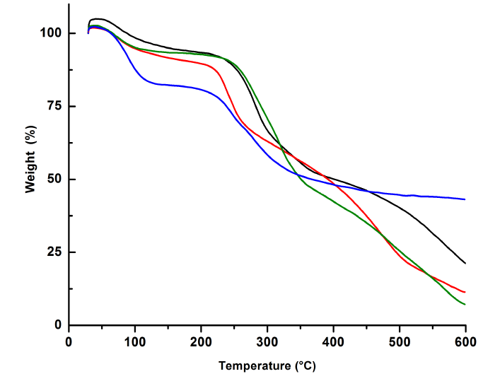 FT-IR spectra were recorded in a Thermo Nicolet 6700 spectrophotometer equipped with an ATR-FTIR accessory. 1H-NMR spectra (in deuterated chloroform and dimethyl sulfoxide) were carried out on a Bruker UltraShield 400 MHz spectrometer. Turbidimetry studies were performed on a UV-vis UV-1700 PharmaSpec spectrophotometer while elemental analysis for C, H and N were carried out with a Thermo FLASHEA 1112 series CHN analyzer. The TGA and DSC studies were performed on a simultaneous Mettler Toledo thermal analyzer, using 5-10 mg of sample of both pristine and functionalized chitosan, varying the temperature from 25°C to 600 °C at a 10ºC/min rate.