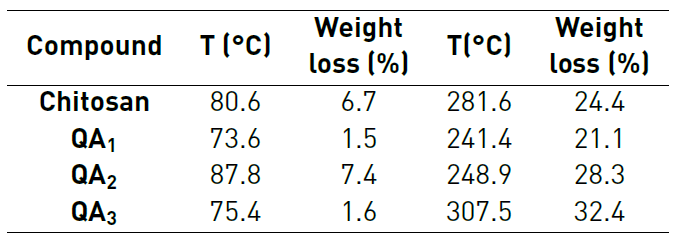 Thermogravimetric analysis showed that imine-chitosan derivatives are decomposed in two main steps (See Figure 4 and Table 2]. The first step starts at 45 and 50 °C, usually attributed to the loss of residual or physically adsorbed water in the polymers [67]. Extracted chitosan showed two events at 80.6 °C and 281.6 °C due to the loss of water and several processes such as dehydration of the glycosidic rings, depolymerization and decomposition of the deacetylated and acetylated units, respectively [18, 68, 69]. Whereas the loss of water for the imine-derivatives occurs between 75°C and 90 °C, the temperature were extracted chitosan loses the most of its mass is higher than that for the derivatives QA1 and QA2 , but lower than the one for QA3 . In the case of QA1 and QA2, both aldehyde derivatives have very polar groups, including carboxyl, amine, and alcohol terminals able to form hydrogen bonds and electrostatic interactions in the structure which can lead to more effective cross-linking, increasing the stability of the polymer. This effect has been previously achieved with other types of chitosan derivatives [70]. On the other hand, the lower stability for QA3 may be due to the inserted substituents that should disorganize the crystalline structure of chitosan, achieved by hydrogen bonds formed between chains of polymer [71-74]. Additionally, the hydrazonyl group would not be able to generate enough electrostatic forces to stabilize the obtained polymer.