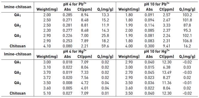 As it was mentioned before, pristine chitosan exhibits a larger Pb(II) removal in acid media while imine-chitosan derivatives a superior in basic pH´s. These results are of great importance since leads to the potential use of chitosan for treatment of contaminated water and therefore it deserves a further analysis as it is going on in our research group.