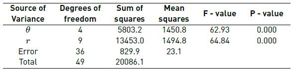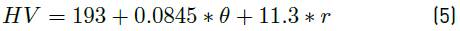 Table 1 shows the results of the analysis of variance (ANOVA) performed on experimental data with a confidence level of 95%, made with average microhardness values for different values of distance from the center (r) and the variation of the angle of twist (θ). The results put in evidence that all main factors are significant affecting the microhardness (P < 0.05) [16]. Additionally, F-test decides whether the parameters are significantly different. A larger F-value would show greater impact [16], in this case they have similar impact on the microhardness.