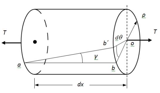 From the shaft in Figure 1, an infinitesimal element of length (dx) between two cross-sections is examined in Figure 2. Since the distance is infinitesimal, the difference in rotations of the cross-sections, defined by the angle (dθ), is also infinitesimal. As the cross-sections sustain the rotation (dθ), segment (ab) deforms into (ab´). By observing this distortion, it can be established that the angle (γ) is the shear strain of the element.