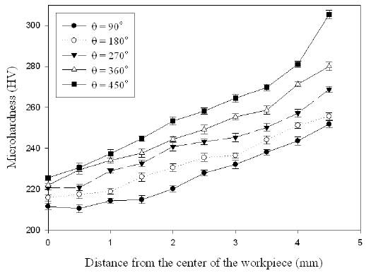The microhardness increases when the torsion parameters, the angle of twist (θ) and distance from the center (r) increase.