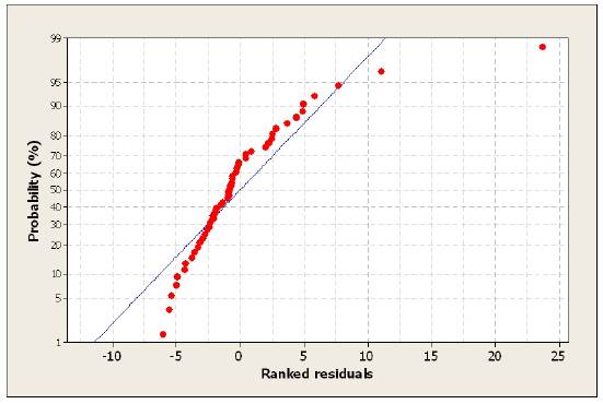 The normal probability plot for the model is shown in Figure 7. The general tendency reveals that the residuals fall in a straight line, showing that the errors are distributed normally, and implying that the dependability of the expression is proven [16].