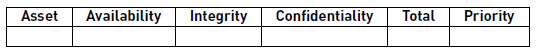 Table 1 shows the assets valuation table and Table 2 shows the staff assets valuation table. In the two tables, the evaluator must give a value of the previous scale to each feature and put the average of the three values in total column. Next, assets must be ordered from highest to lowest total value and give them a priority (fewer priority to greater total values). If two or more assets have the same value, the evaluator must decide, which of the assets is more important for the system. Thus, the result of this evaluation is a prioritized list of the assets. In prioritizing, the evaluator must include both the staff assets and the other assets in the numbering.