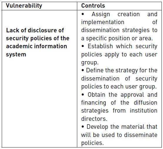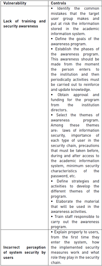 Thus, seven very high-level risks were identified due to: unawareness of security policies of ACADEMUSOFT and lack of training and security awareness by teachers, CIADTI staff and students; lack of confidentiality and complexity of the password of the teachers; lack of a formal procedure to remove users from the system and to review periodically access rights; lack of information security provisions in employee contracts; and lack of security policies for ACADEMUSOFT. Therefore, it is important to create and disseminate complete security policies, as well as awareness and training to users about system security. Therefore, it is important to create and disseminate complete security policies, as well as awareness and training to users about system security.