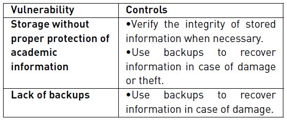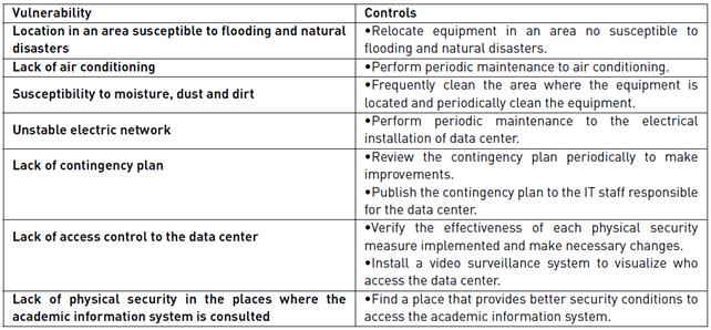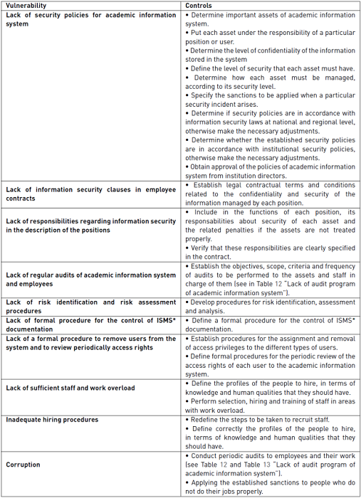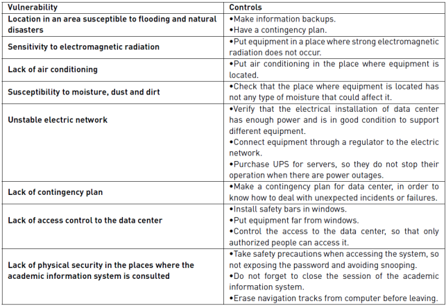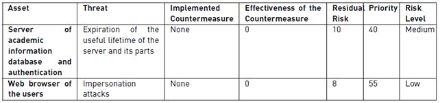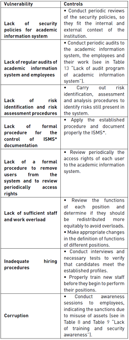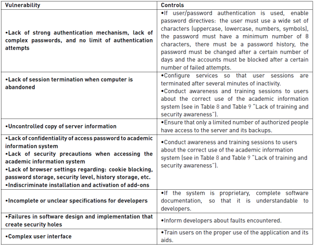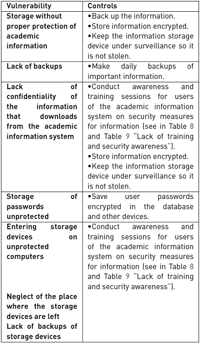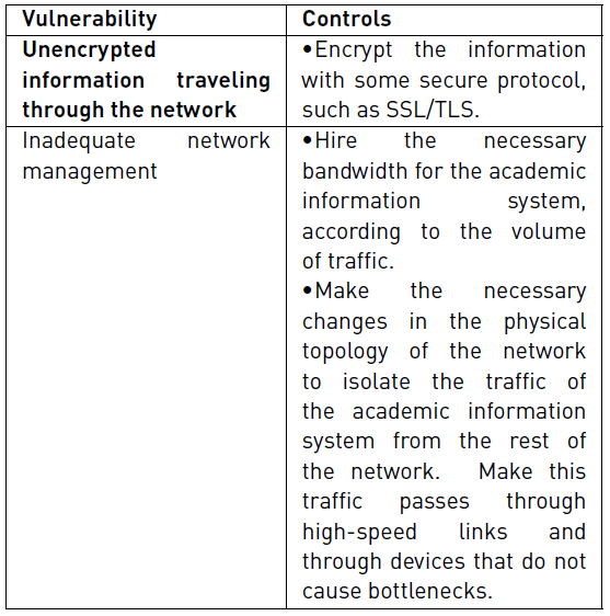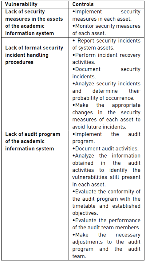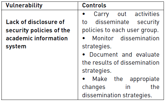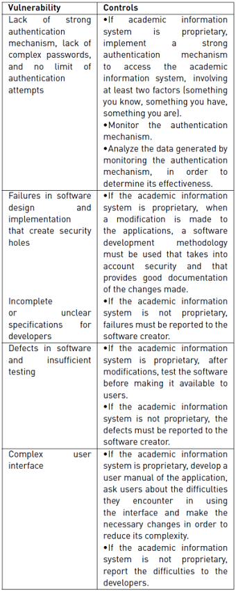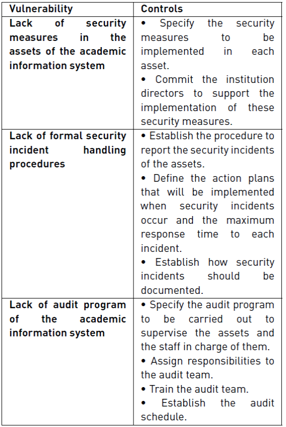 Although, the main vulnerabilities of the assets in an academic information system were identified to give some guidance to the IT staff (tables of step 4), other vulnerabilities can arise from the risk analysis due to the environment of each system.