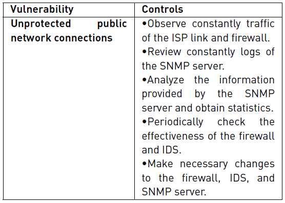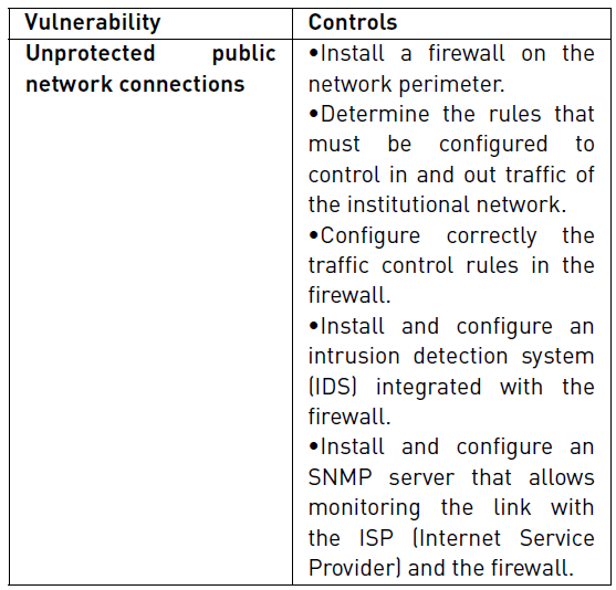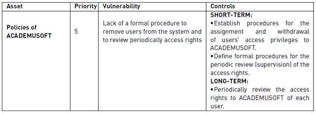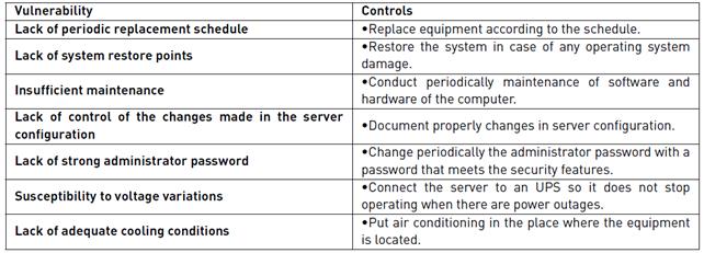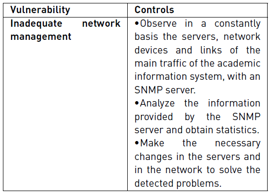 In step 4, short-term and long-term controls were determined, according to the tables of step 4. When vulnerabilities did not match those of the tables, the most resembled vulnerabilities were taken as examples to establish the controls, using common sense and security knowledge. Table 33 shows an example of the results obtained.
