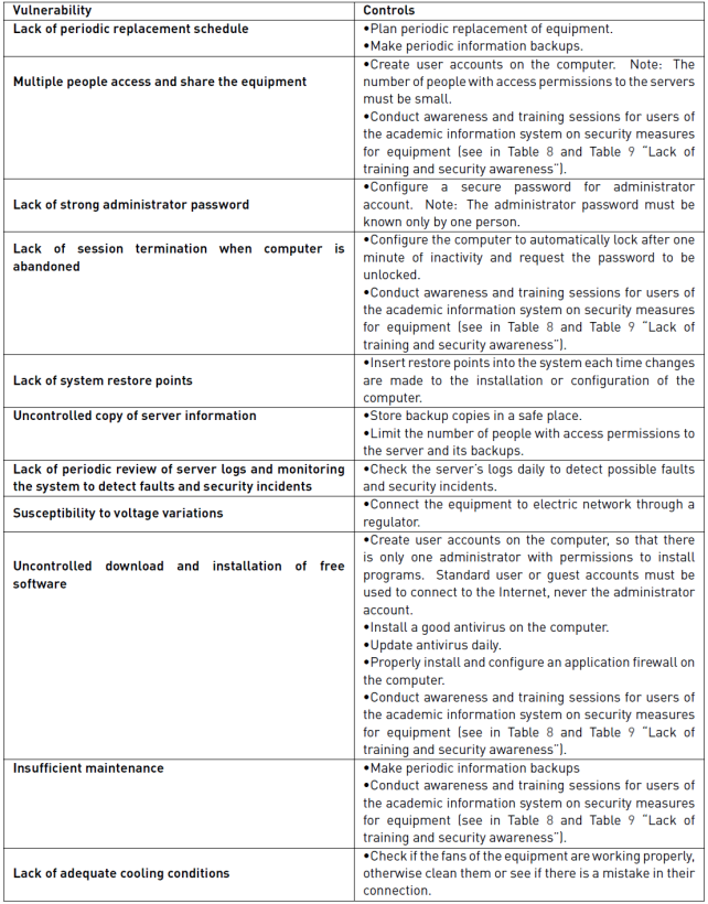 The evaluator must consult Table 3 to determine which vulnerability corresponds to the threat evaluated in Table 5 and find out each vulnerability in the tables of this section, in order to define the short and long term controls to be planned and implemented.