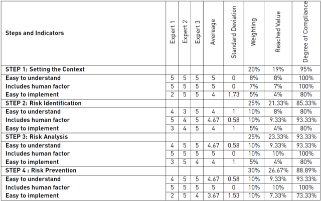 According to Table 26, the degree of compliance was higher for steps 1 and 3 than for steps 2 and 4. In addition, in step 1, the degree of compliance of the indicator “easy to implement” is 80% (standard deviation: 1.73), because expert 1 gives a grade of 2, since institutions do not allocate resources for risk prevention.