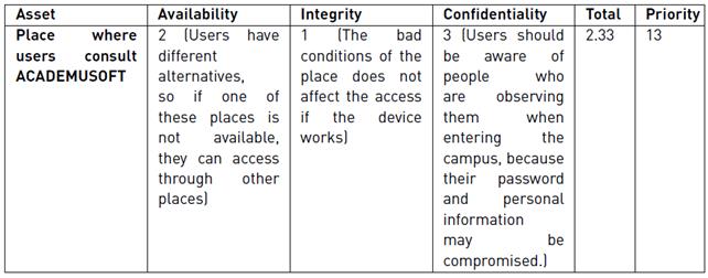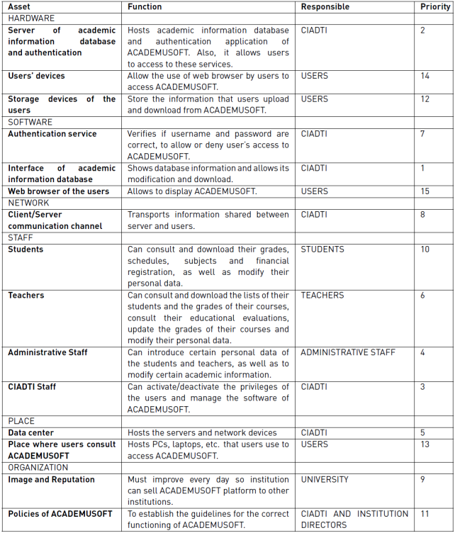 Since CIADTI staff did not provide all information of ACADEMUSOFT needed, some assumptions were made about the possible vulnerabilities and threats of the assets and their value. It is recommended that the IT staff of each institution carries out this methodology because it has all the information for its development, and it is necessary that somebody knows about information and network security.