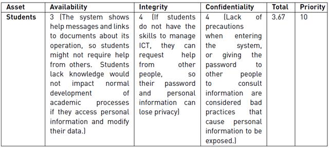 In addition, personal data of teachers, students, and academic information must have a high level of privacy. Law 1581 of 2012 [22], must be taken into account because it regulates the usage of personal data of users. Finally, a risk analysis was made by including the 15 assets involved in the processes.