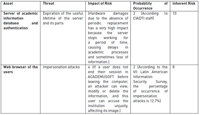 The proposed Likert scale was used in step 3, to grade the impact of risk, taking into account the damages that the threat can cause to ACADEMUSOFT and the institution. Afterwards, CIADTI staff was asked to give the probability of occurrence of each threat, according to the quasi-exponential Likert scale of step 3. In some cases, it was necessary to use the results of the VII Latin American Survey on Information Security [18] if the CIADTI staff did not give an specific value. To find out students and teachers threats, the results of the surveys carried out in the institution were valuable. Then, by multiplying the impact of risk, and the probability of occurrence it was obtained the inherent risk (see Table 31].