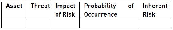 Table 4 shows the fields that the evaluator must fill, using threats identified in Table 3. In addition, the evaluator must calculate the inherent risk, multiplying the impact of risk (IR) and the probability of occurrence (PO) (see Equation (2)].