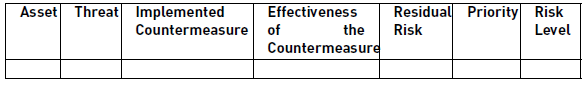 Then, it is necessary to determine the countermeasures implemented in the system to mitigate each threat. Table 5 shows the fields that must be fill, using threats identified in Table 3. In the third column, the evaluator must describe the countermeasure and in the fourth column, the effectiveness of the countermeasure (EC) must be determine according to the next scale: