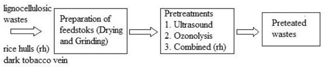 The tobacco and rice wastes have differences in terms of lignocellulosic composition. This has an effect on the pretreatment to be applied. Within the range of studied variables with the ultrasound alternativefor reliability of 95%, the results are not so clear. The type of residual, the moisture content and the interaction between both are the variables with significant influence, for reliability of 90% for the ozone alternative. For the studied conditions, the pretreatment with ozone is more effective to degrade the lignin than the ultrasound pretreatment. The best results of both pretreatments are obtained for the rice hull. The combined pretreatment showed higher degradation of lignin for the studied wasted (rice hulls), and it fixes with the structural transformation presented.
