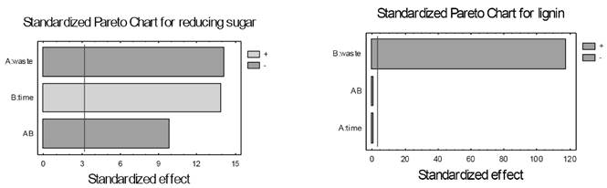 The statistical processing of the results for this pretreatment shows that the studied factors have significant influence, for reliability of 95%, on the reducing sugars and only the type of residual in the case of lignin. This corresponds to the qualitative analysis of the previous Table. This behavior isillustrated in Figure 3 and it is associated to the remarkable difference of lignin content in both residuals.
