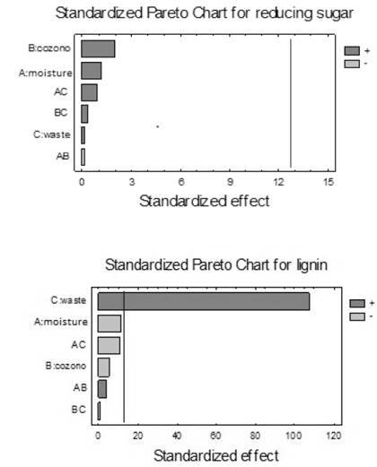 The effects of the studied variables are reported in Figure 4 with reliability of 95%. Nevertheless, at reliability of 90% it was proved that the moisture content, the waste type and the interaction between these two variables, affect the lignin concentration, but it does not affect reducing sugars. Therefore, the process favors itself for materials with high content of lignin and high moisture contents, since ozone is water-soluble and shows higher reactivity.