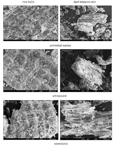 It can be observed that the structure of both pre-processed materials either by ultrasound or by ozone-breaking, suffers a transformation regarding the non-processed material. This can explain results in each pretreatment. In the case of the use of ozone with the higher moisture content (30 %), it is expected that the affectation of the structure for the rice hull is more sensitive because its higher content of lignin and higher reactivity.