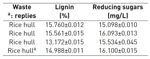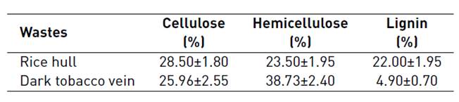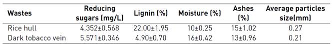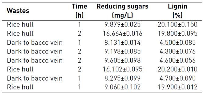In Table 2, the concentrations of lignin, reducing sugars, moisture, ashes and the average size of particle (dp) of the lignocellulosic wastes are shown. As it is observed, the rice hull presents a superior content of cellulose regarding hemicelluloses contents of 28.50% and 23.50%, respectively. However, the dark tobacco vein presents a higher content of hemicelluloses (38.73%) than cellulose (25.96%). Thehighest difference between these two wastes lives in the content of lignin. This aspect influences in its behavior in front of the two studied pretreatments.