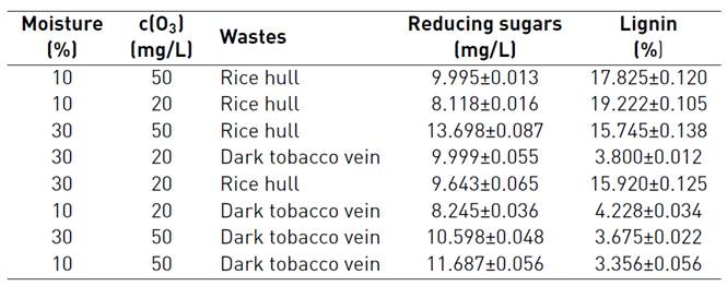 According to the results shown in Table 4, when moisture content of lignocellulosic material increases, the concentration of reducing sugars and degradation of lignin also increase. This does not happen when the ozone concentration increases. This behavior is in accordance to Cubero et al. (2008) [14]. They studied the effect of 5 factors (size of particle, concentration of ozone, flow of gas, waste type, and moisture content), and only the last two proved to be significant, 95 % of reliability. They worked with a flow of 60 L/h of gas and degraded the 65 % of the lignin of the studied material. In the present, the gas flow was 16 L/h, far below the one they used, due to the experimental installation availability. This influenced the low degradation of lignin.