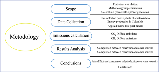 The methodology used for this calculation of GHG from water reservoirs in hydropower plants consists of the scheme [Figure 2], which is deeply related with the inductive approach, taking as starting point the definition of the scope founded on available information to generate a new one. The analysis consisted of the comparison with other types of generation technologies using different resources available in the country. An analysis of the main disadvantages of the hydropower generation technology in the tropical areas during the effects of ENSO phenomenon was also performed [13, 29]. This last aspect results to be important in the energy development planning of the country, the intermittency in the resource affects directly the rate of energy production in a stable way. The effect of this situation is rapidly increasing, leading to critical and unsustainable the energy production in the near future, mainly driven by the global warming and the increasing demand for energy.