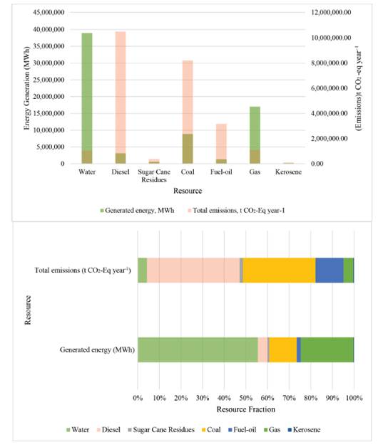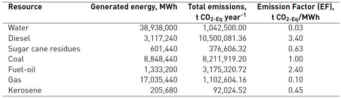 The total emissions and power generation rates were compared with the generation of other resources available in Colombia [Table 8, Figure 3]. From these data, we remarked that hydropower is the resource that generates less GHG emissions per MWh produced, due to a large amount of hydropower production activities in the country. The total emissions from hydropower are larger than the sugar cane residues or kerosene burning for energy generation purposes.