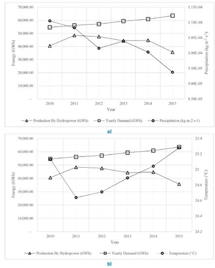 In order to quantitatively analyze the effect of ENSO macroscale phenomenon over Colombia, the internal energy demand and energy production by hydropower technology must be considered simultaneously with precipitation rates and temperature along the country. Figure 5 summarizes this data between the years 2010 and 2015 [2, 31, 34]. Figure 5-a compares the internal energy demand and production by hydropower technology against precipitation, showing the increasing demand and energy production in the same proportion along the 2010 to 2015 period. Meanwhile, the precipitation decreases in 2012, and again in 2015 to its lowest value. Figure 5-b shows the internal-national energy demand and energy production by hydropower technology with temperature, as mentioned above temperature has its lowest value in 2011. After this year, the surface temperature increases gradually until its highest value in 2015, according to the presence of the ENSO phenomenon in the region.