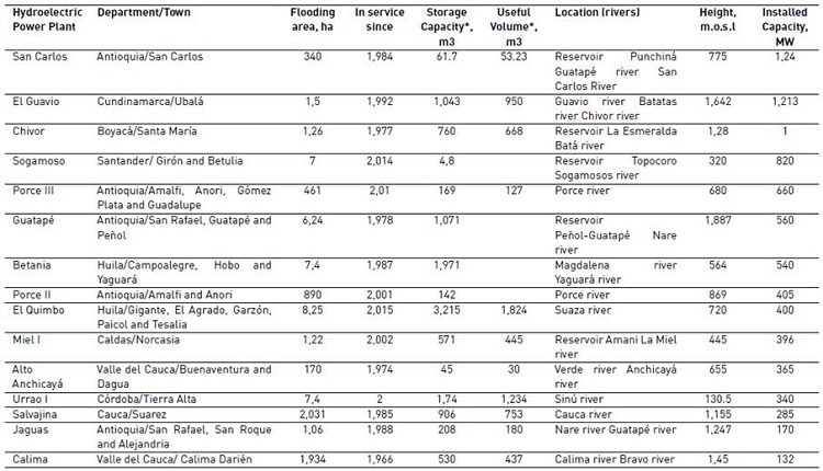 In this research, the main hydroelectric power plants in Colombia were considered as the hydropower facilities with the biggest flooded areas associated with their operation [Table 3, Figure 1]. Table 3 summarizes the main hydroelectric power plants in the country. Data about the flooded area and reservoir capacity were detailed for GHG diffuse emissions calculations, which are described in the next sections.